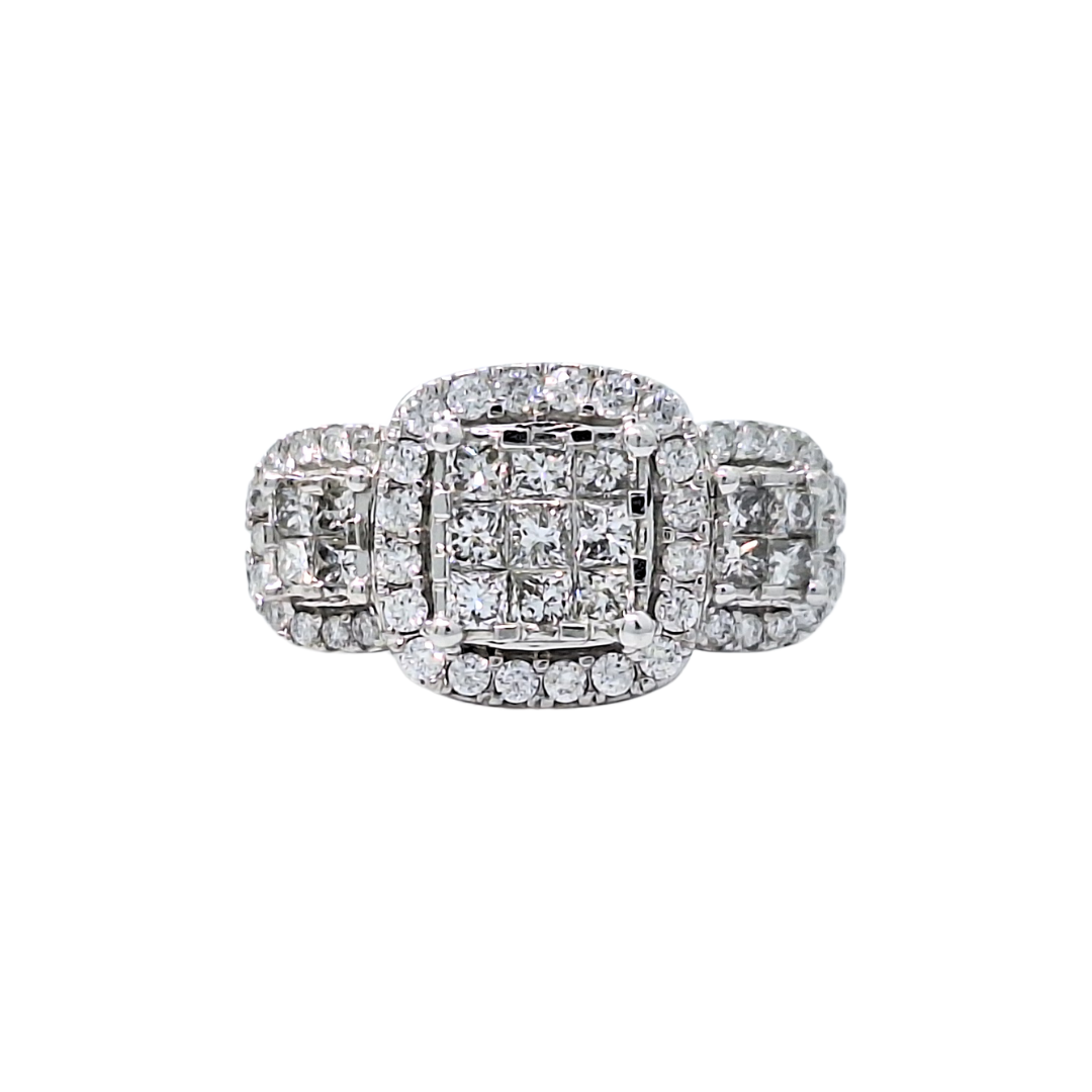 Crafted in luxurious 10ct white gold, this stunning diamond cluster ring gives the illusion of a classic three-stone design with a modern twist. The centre is made up of princess cut diamonds, tile set for a seamless look, flanked by two matching clusters on each side—each with four princess cut stones. Surrounding the entire trio is a sparkling halo of round brilliant diamonds that adds extra depth and radiance. A bold yet elegant piece, perfect for someone who loves statement sparkle with contemporary styling.