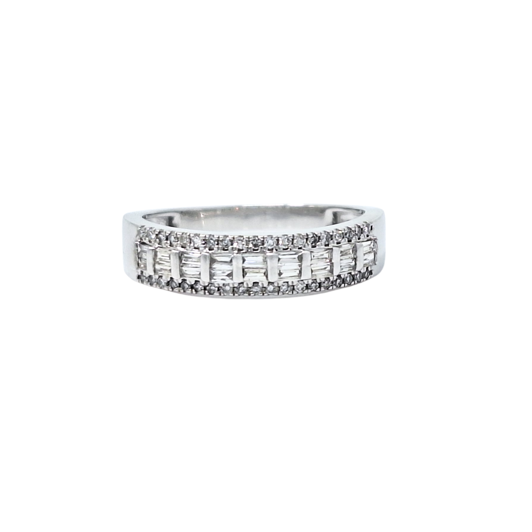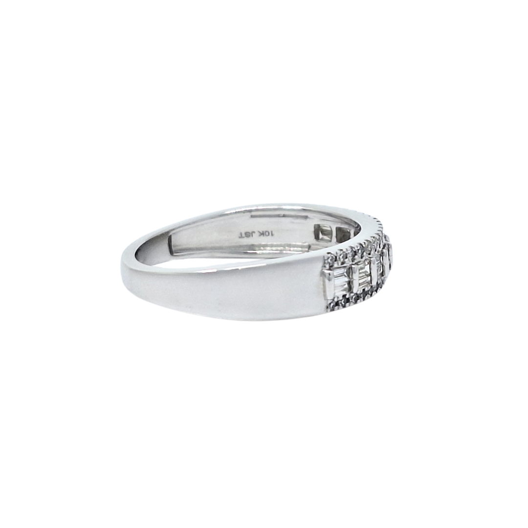 This 10ct white gold fancy band ring features a beautiful blend of baguette and round brilliant diamonds, creating a look that’s both classic and contemporary. The alternating cuts catch the light differently for a dynamic sparkle across the finger. With a total diamond weight of 0.40ct, this ring is ideal as a statement band, an anniversary gift, or a unique wedding ring with modern flair. Understated luxury you can wear every day.