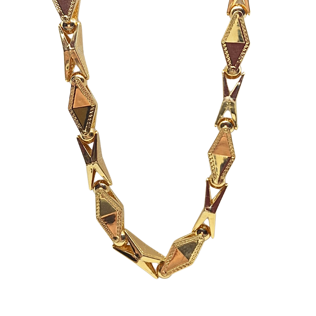 Pre-loved 14ct yellow gold chain featuring a distinctive geometric link design that adds texture and character. Measuring 26 inches, it offers a comfortable length with a bold, stylish presence. A versatile piece that can be worn solo as a statement or layered for a contemporary look.