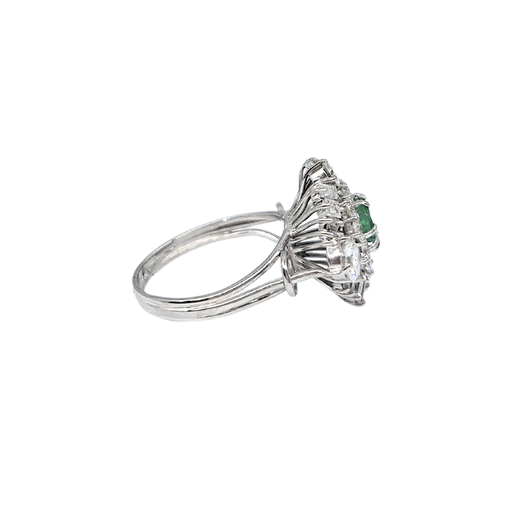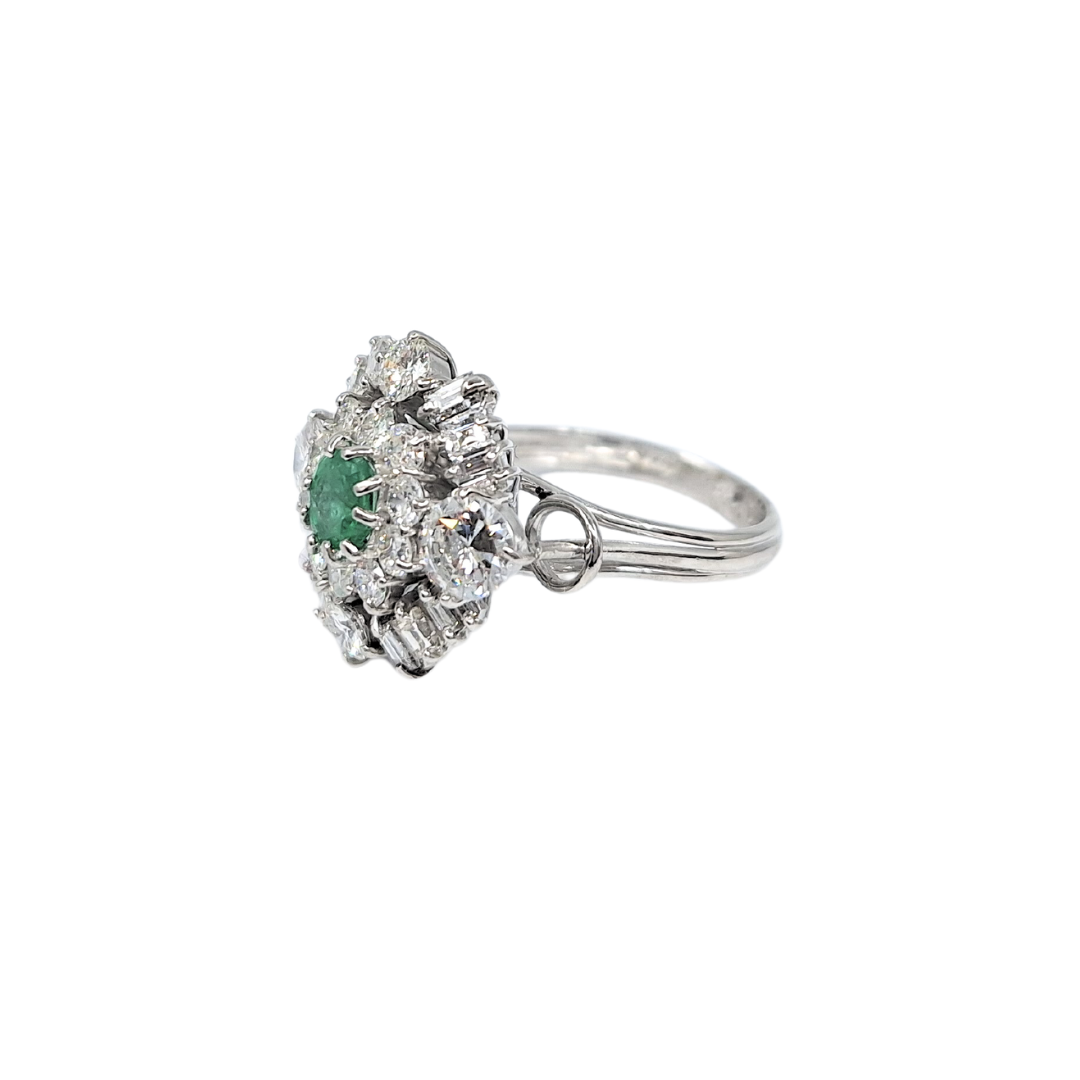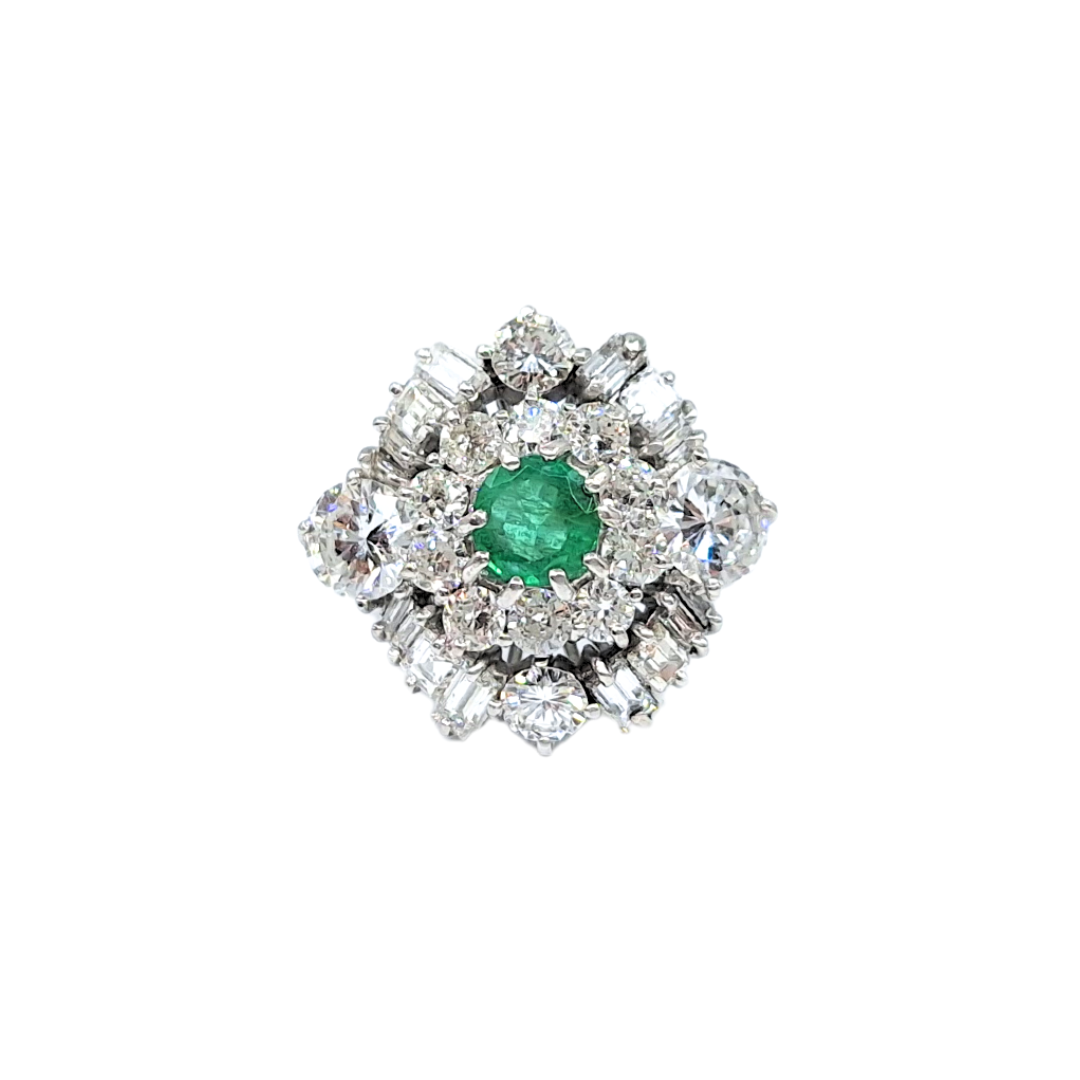 At the heart of the ring, a central round cut emerald takes centre stage, exuding a vivid green hue. Surrounding the emerald, a cluster of brilliant cut and baguette cut diamonds creates a mesmerizing halo, amplifying the emerald's natural beauty and bringing a unique and exquisite element to the ring,