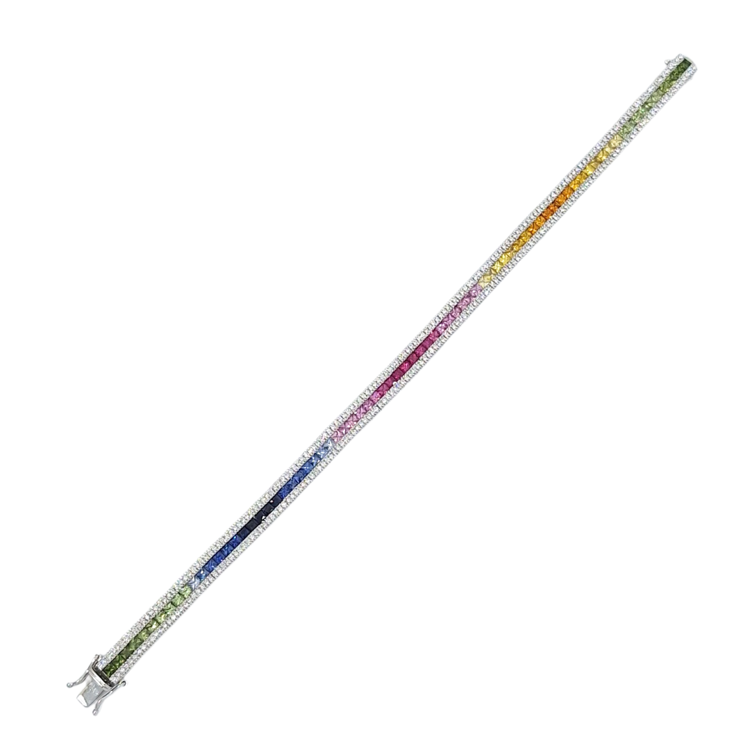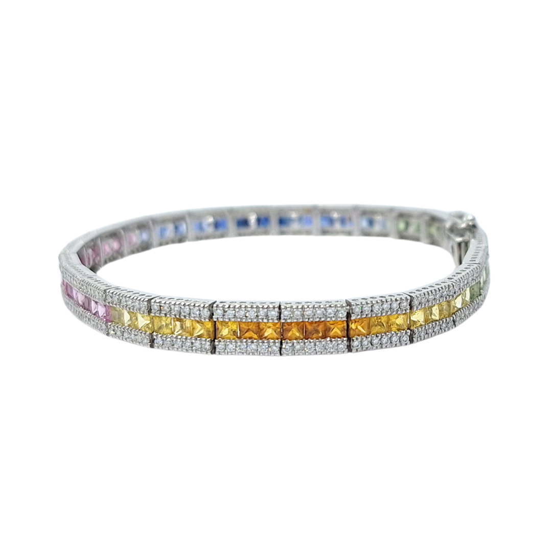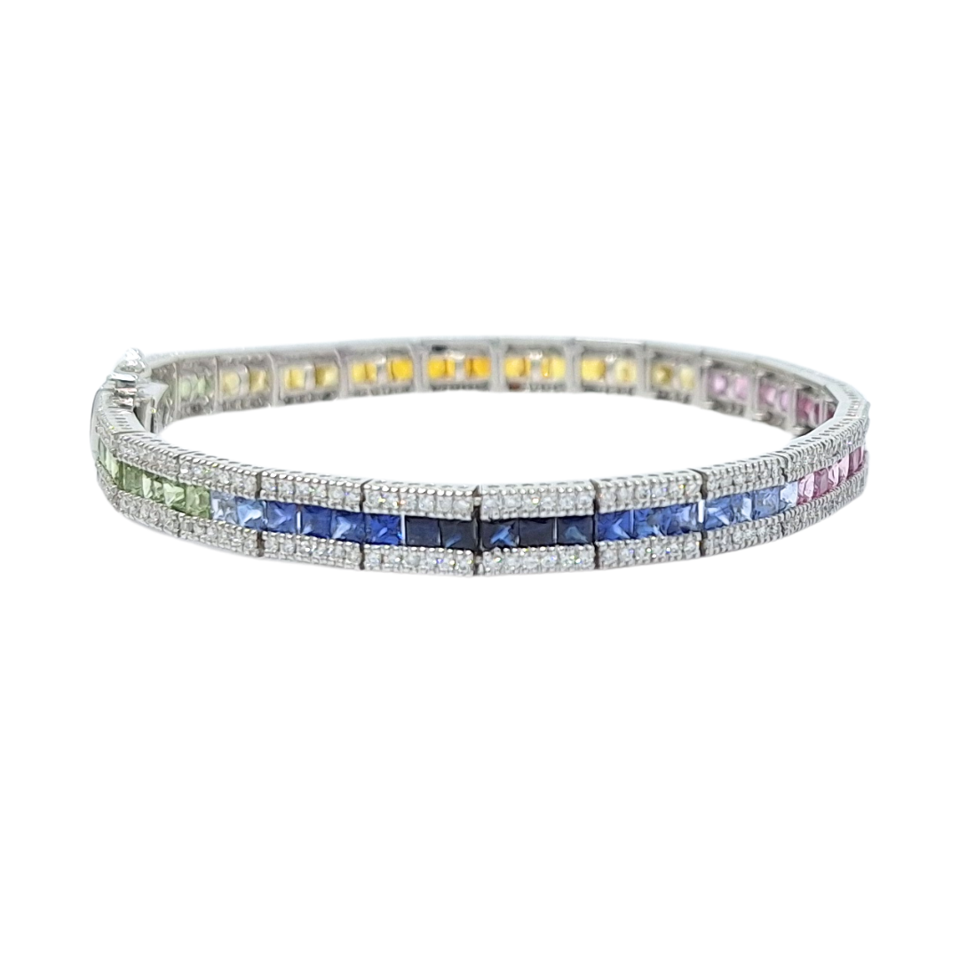 Pre-loved as new 18ct white gold bracelet features a stunning array of rainbow-coloured sapphires, beautifully accented by sparkling diamonds. The brilliant mix of colours creates a striking contrast against the sleek white gold setting, offering both elegance and individuality. A dazzling statement piece—perfect for adding colour, sparkle, and sophistication to any jewellery collection.
