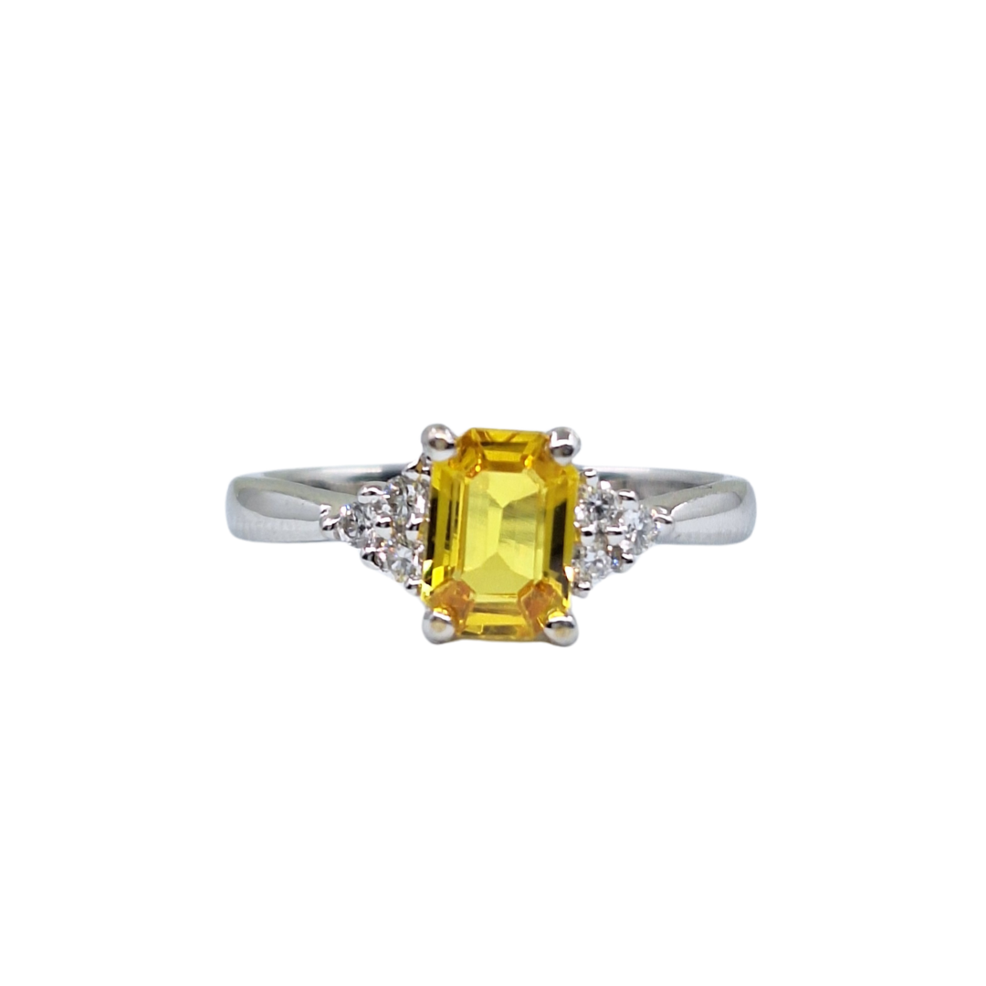 This beautiful 18ct White Gold Yellow Sapphire & Diamond Trefoil Ring features a vibrant emerald-cut yellow sapphire at the centre, perfectly complemented by sparkling diamond trefoil shoulders. Set in sleek white gold, the bright yellow sapphire creates a striking contrast, making this ring a timeless and elegant choice for everyday wear or a special occasion.