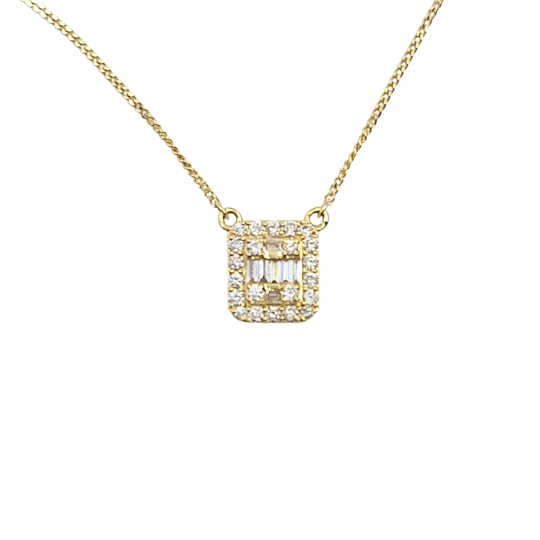 Pre-loved 18ct yellow gold stunning diamond cluster necklace featuring a striking rectangular pendant set with a mix of baguette and round brilliant diamonds. The clean lines of the baguettes contrast beautifully with the sparkle of the round stones, creating a bold yet elegant look. Suspended from a fine chain, this piece is perfect for special occasions or elevating everyday style. A timeless design with modern appeal.