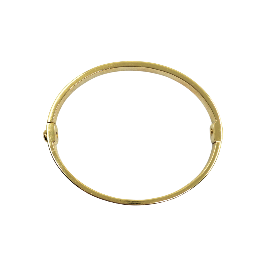 Pre-loved 18ct yellow gold baby screw bangle is crafted in a Cartier-inspired style, featuring bezel-set diamonds spaced evenly around the band for a subtle yet luxurious sparkle. The polished gold finish enhances its timeless design, while the secure screw fastening ensures both comfort and safety. A refined and elegant keepsake, perfect for marking a special occasion.