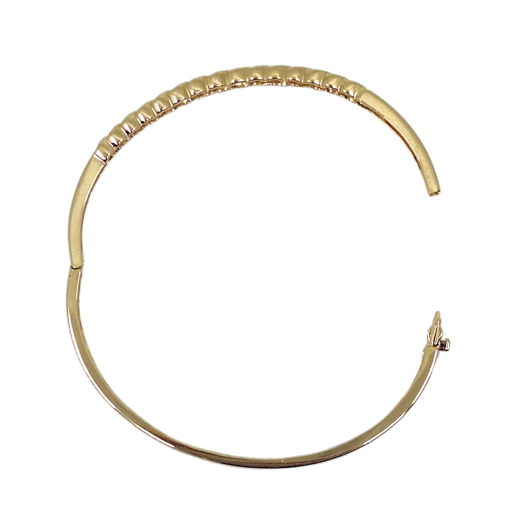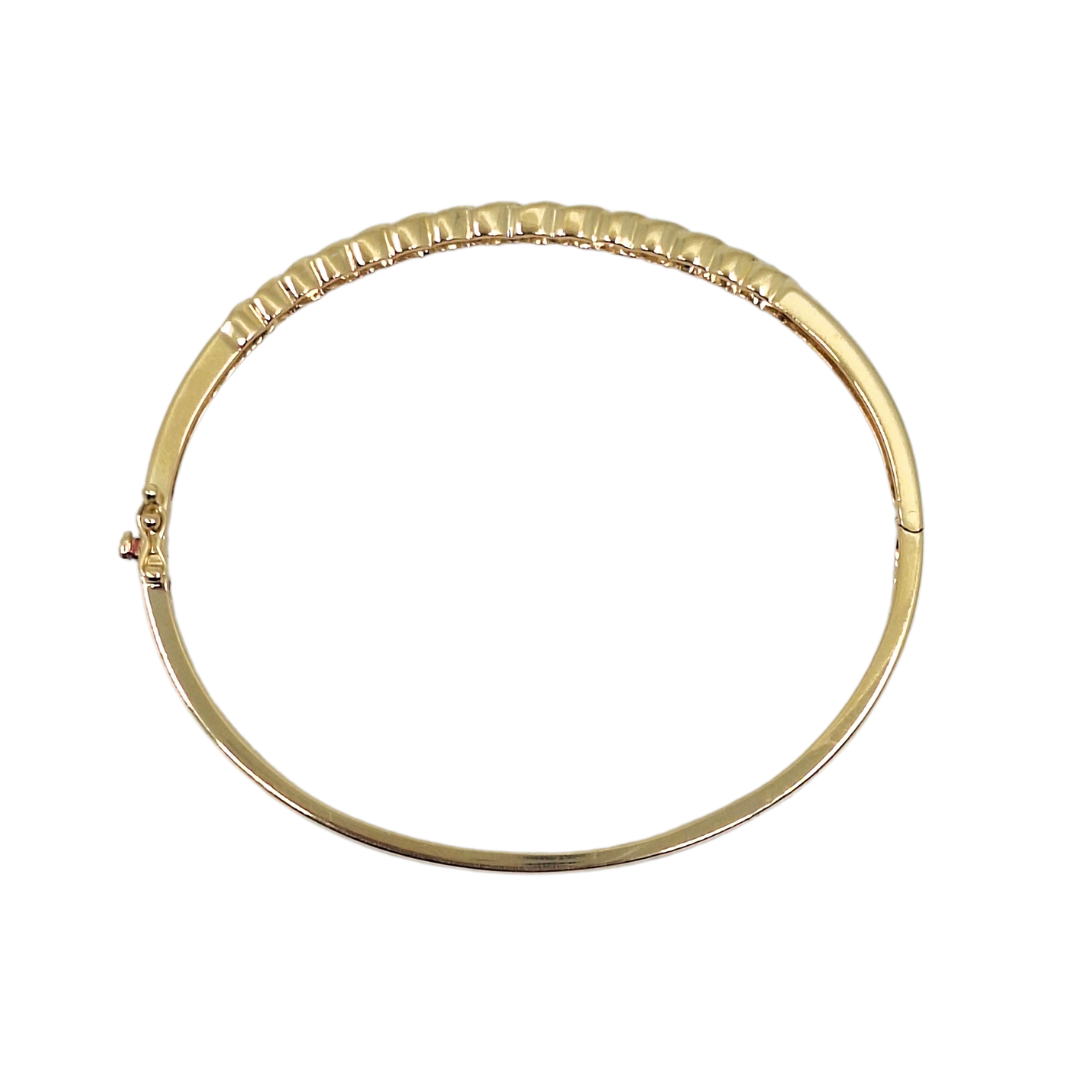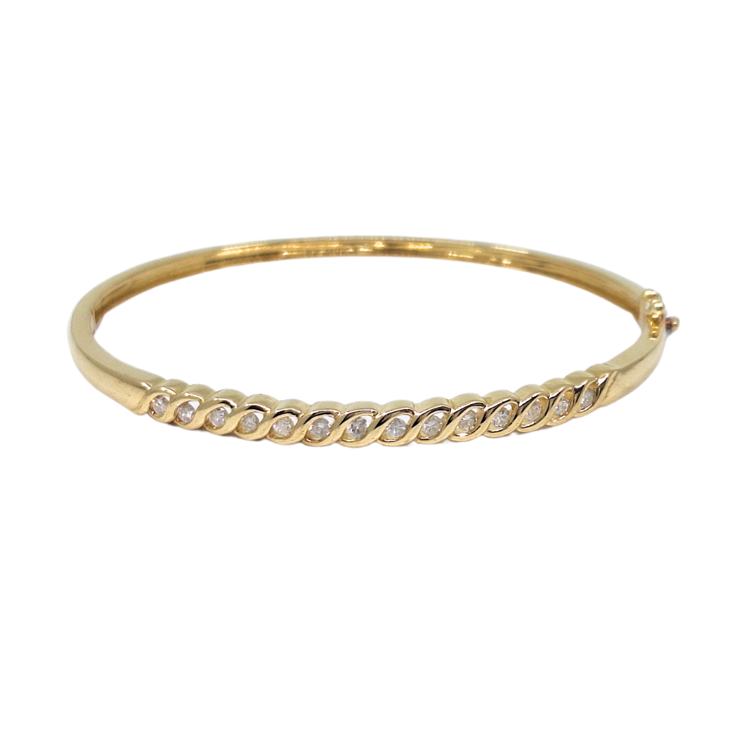 Pre-loved 18ct yellow gold diamond bangle features 14 small round brilliant diamonds, each set horizontally across the band for a modern and elegant look. The diamonds are carefully arranged to create a continuous sparkle, making this bangle perfect for both everyday wear and special occasions. The piece is finished with a secure safety catch clip, ensuring both style and functionality. A stunning addition to any jewellery collection, this bangle exudes sophistication and timeless beauty.
