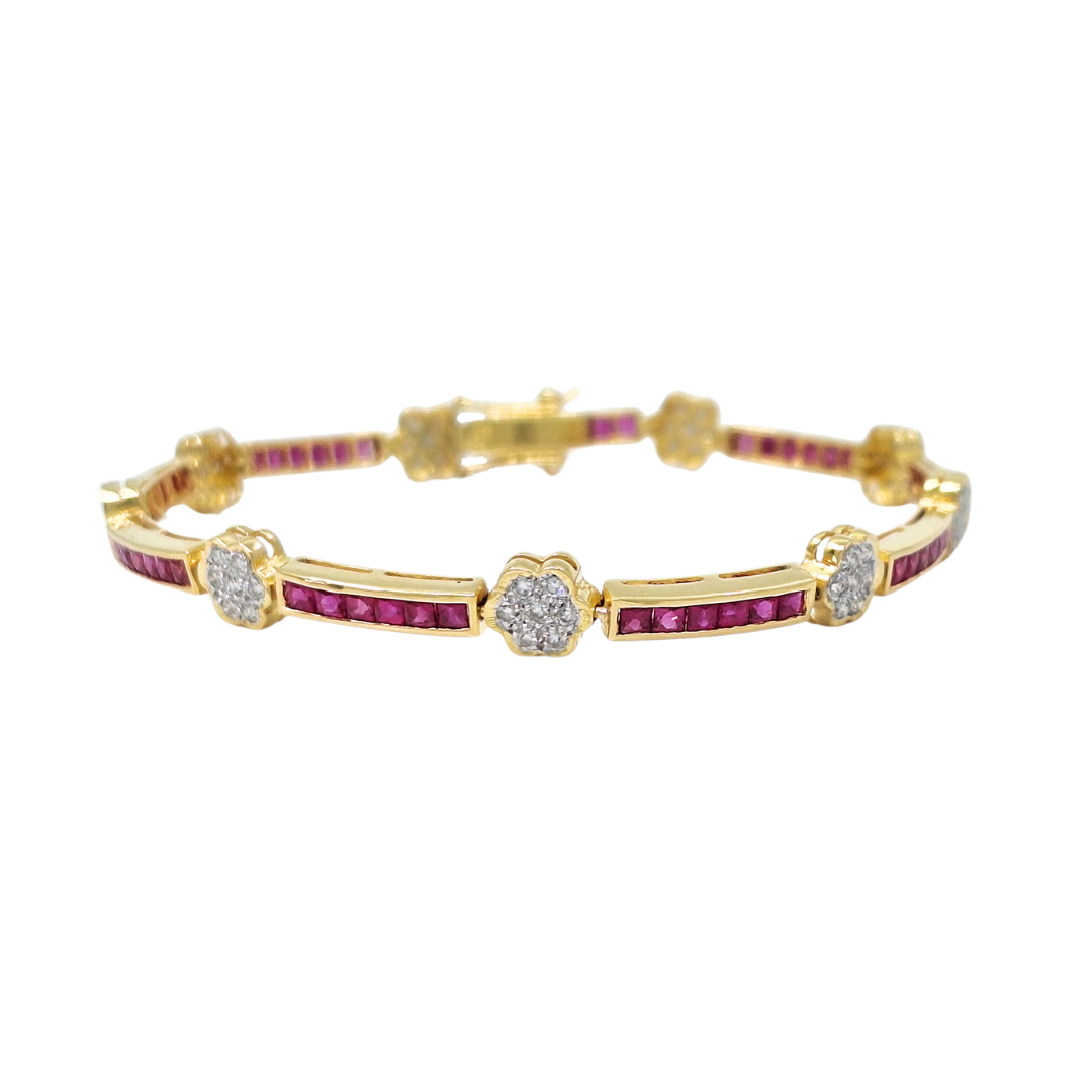 Pre-loved 18ct yellow gold bracelet features alternating sections of rich ruby bars and sparkling diamond flower clusters. The deep red rubies contrast beautifully with the brilliance of the diamonds, creating a striking rhythm of colour and sparkle. A refined and elegant piece—perfect for special occasions or adding timeless luxury to any jewellery collection.
