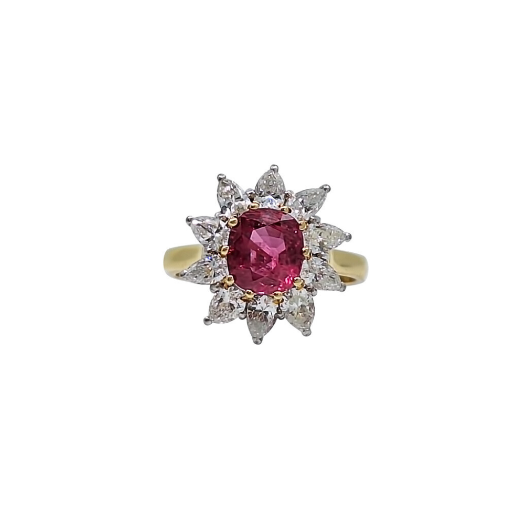Pre-loved 18ct yellow gold ring features a vivid 1.75ct oval-cut ruby at its centre, surrounded by a stunning arrangement of pear-cut diamonds totalling approximately 1.75ct. The unique pear-shaped surround adds elegance and dimension, enhancing the rich red hue of the ruby. A statement cluster design that radiates sophistication—perfect for special occasions or as a treasured heirloom piece.