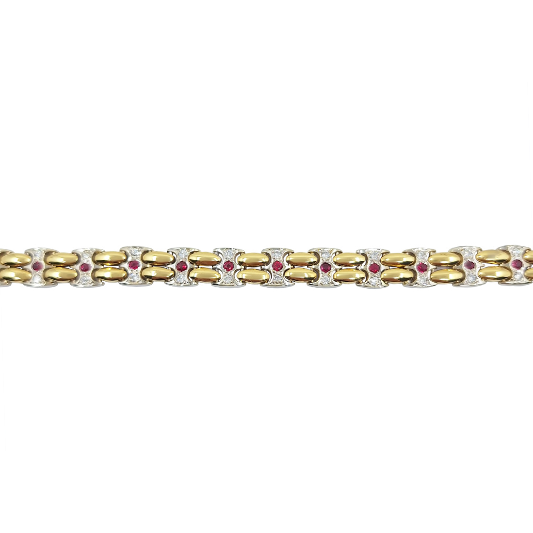Pre-loved 18ct yellow and white gold ruby and diamond bracelet. A timeless piece of elegance and sophistication. Featuring rich red rubies, beautifully set alongside sparkling diamonds, this bracelet showcases a perfect balance of colour and brilliance. The alternating yellow and white gold links enhance the contrast between the gemstones, adding a refined and luxurious touch. Designed for both special occasions and everyday elegance, this bracelet is a striking addition to any jewellery collection, combining classic craftsmanship with timeless beauty.