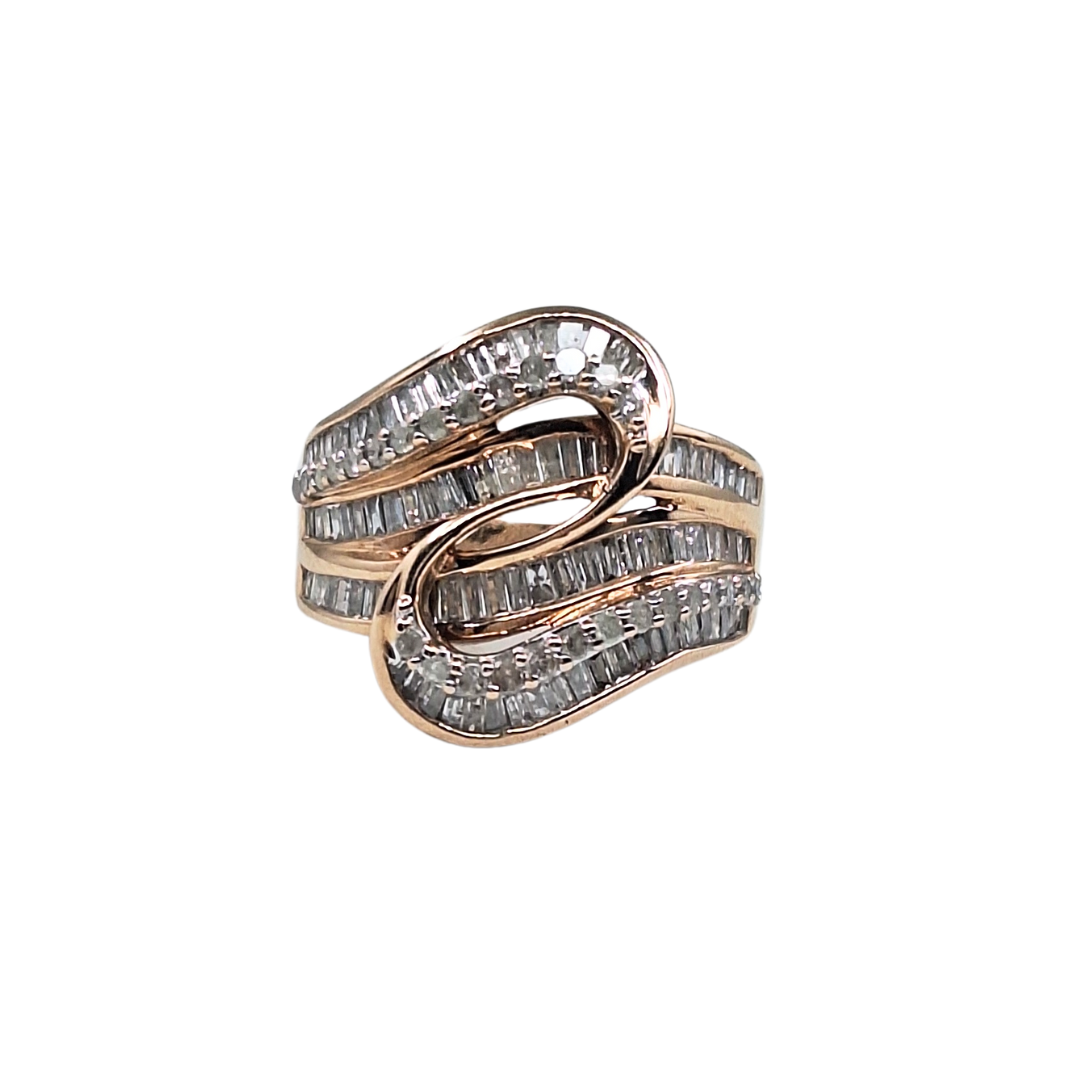 9ct rose gold ring features a graceful swirl design set with sparkling baguette-cut diamonds throughout. The cluster-style arrangement adds brilliance and depth, while the warm rose gold enhances the ring’s modern yet timeless appeal. A sophisticated piece that blends classic sparkle with contemporary style—perfect for special occasions or everyday elegance.