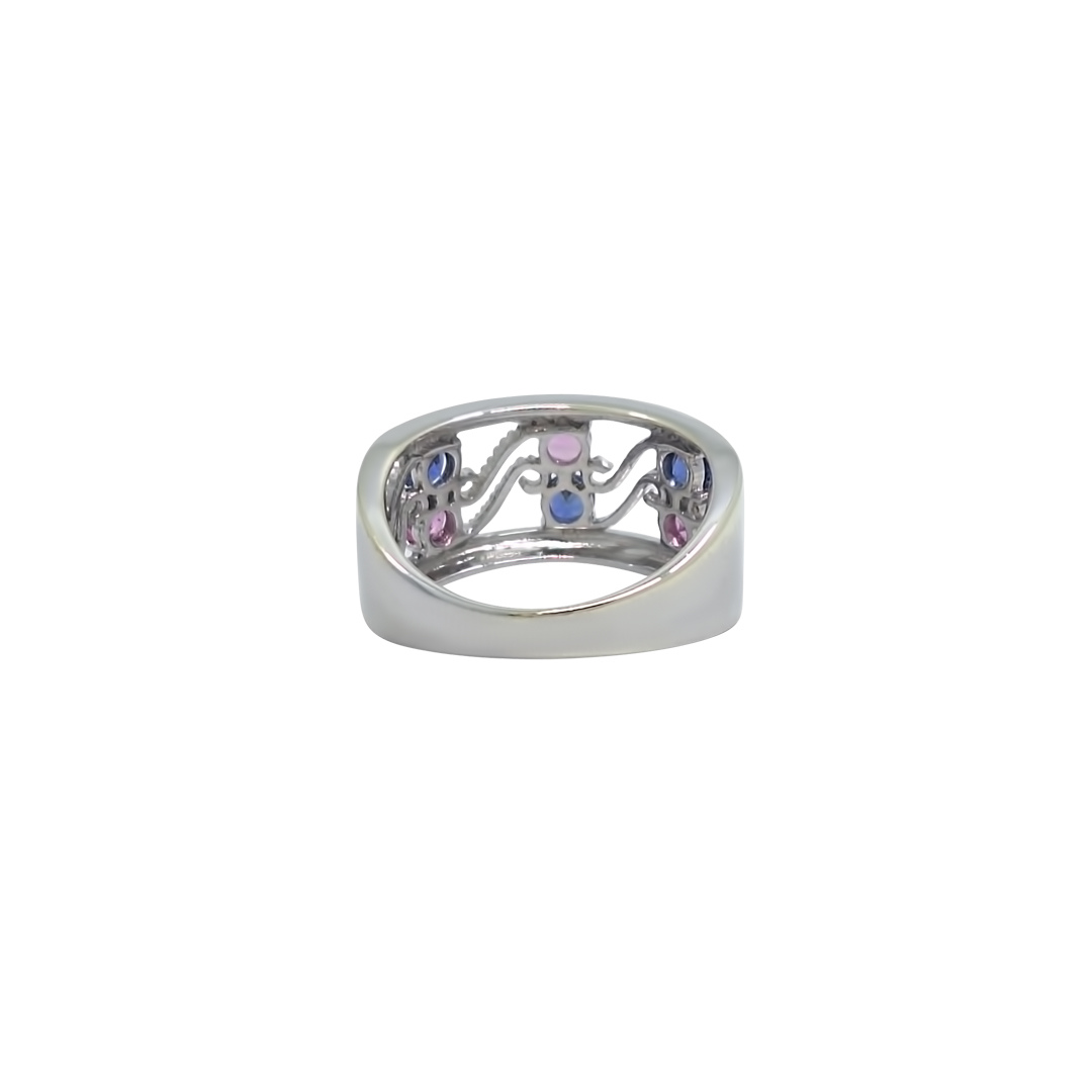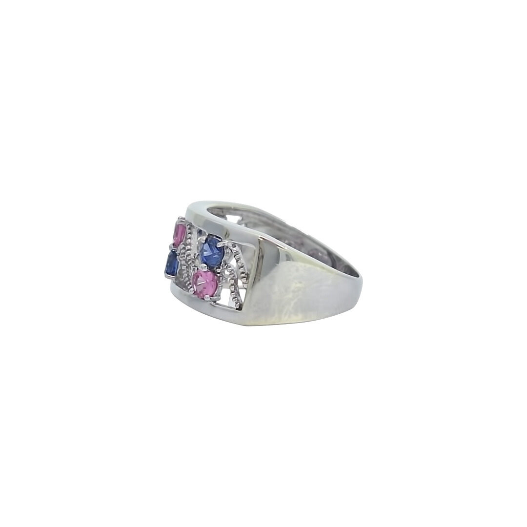 Pre-loved 9ct white gold open band ring features three small pink sapphires and three small blue sapphires set in an alternating pattern. The open design gives the ring a light, modern look, while the polished white gold enhances the colour of the stones. Simple, balanced, and comfortable for everyday wear.