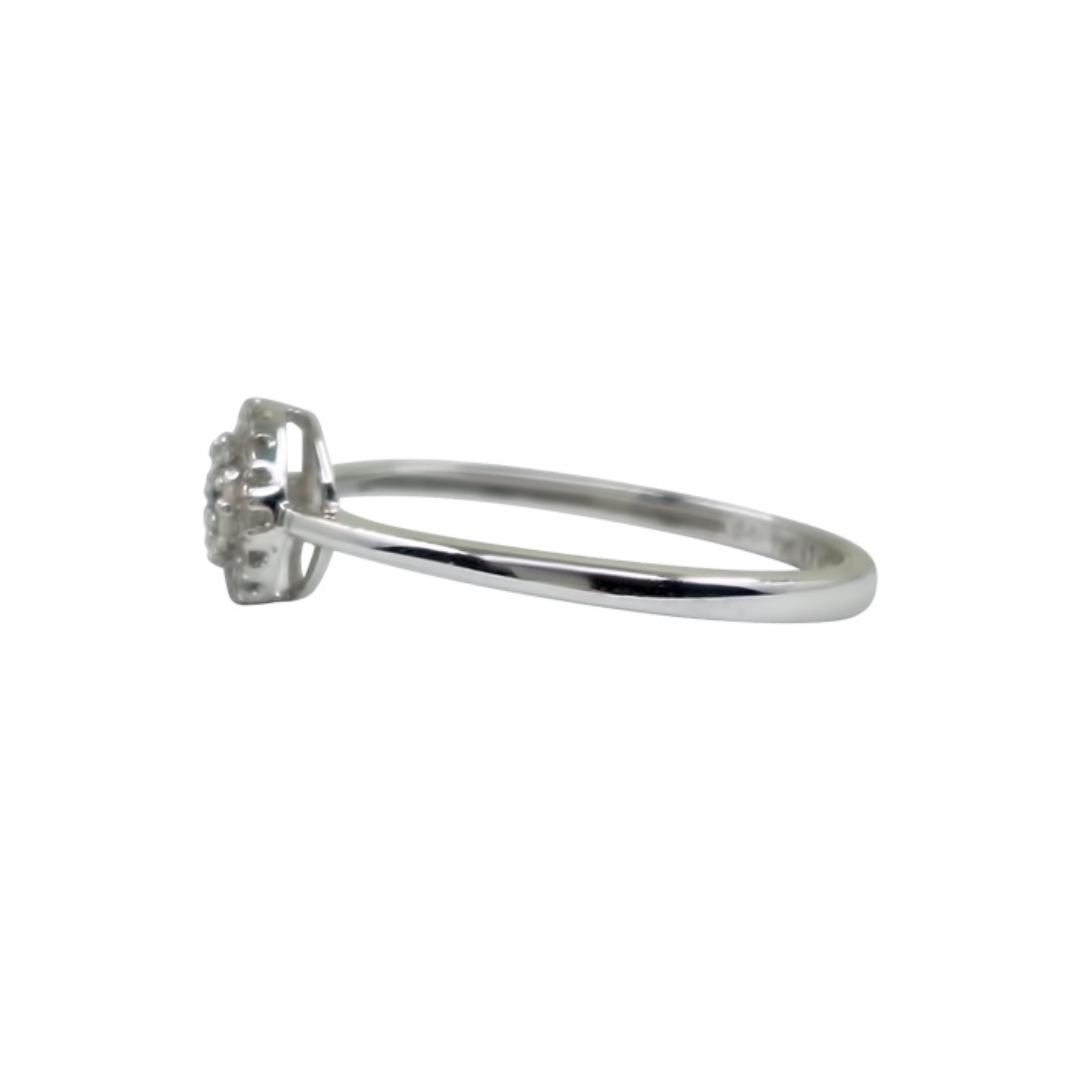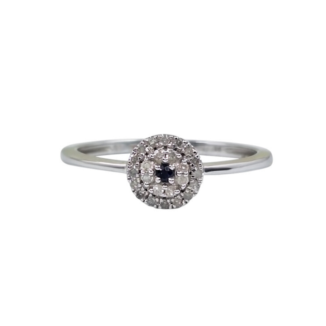 Delicate and timeless, this 9ct white gold ring features a round cluster design set with a tiny deep blue sapphire and sparkling diamonds. The combination of rich colour and brilliant sparkle creates a refined, elegant look, while the polished white gold setting enhances the overall brilliance. A classic cluster ring—perfect for everyday elegance or special occasions.
