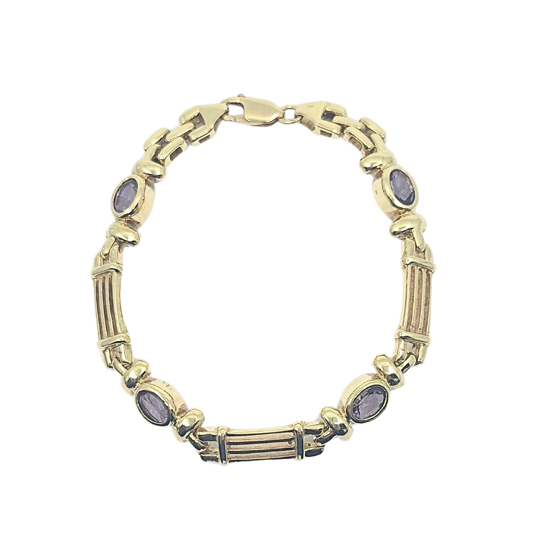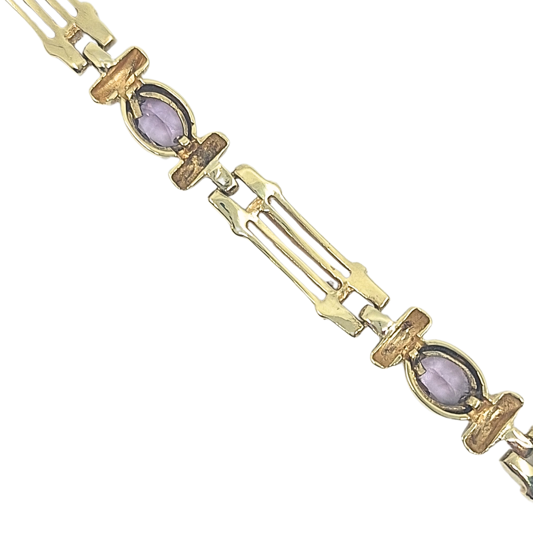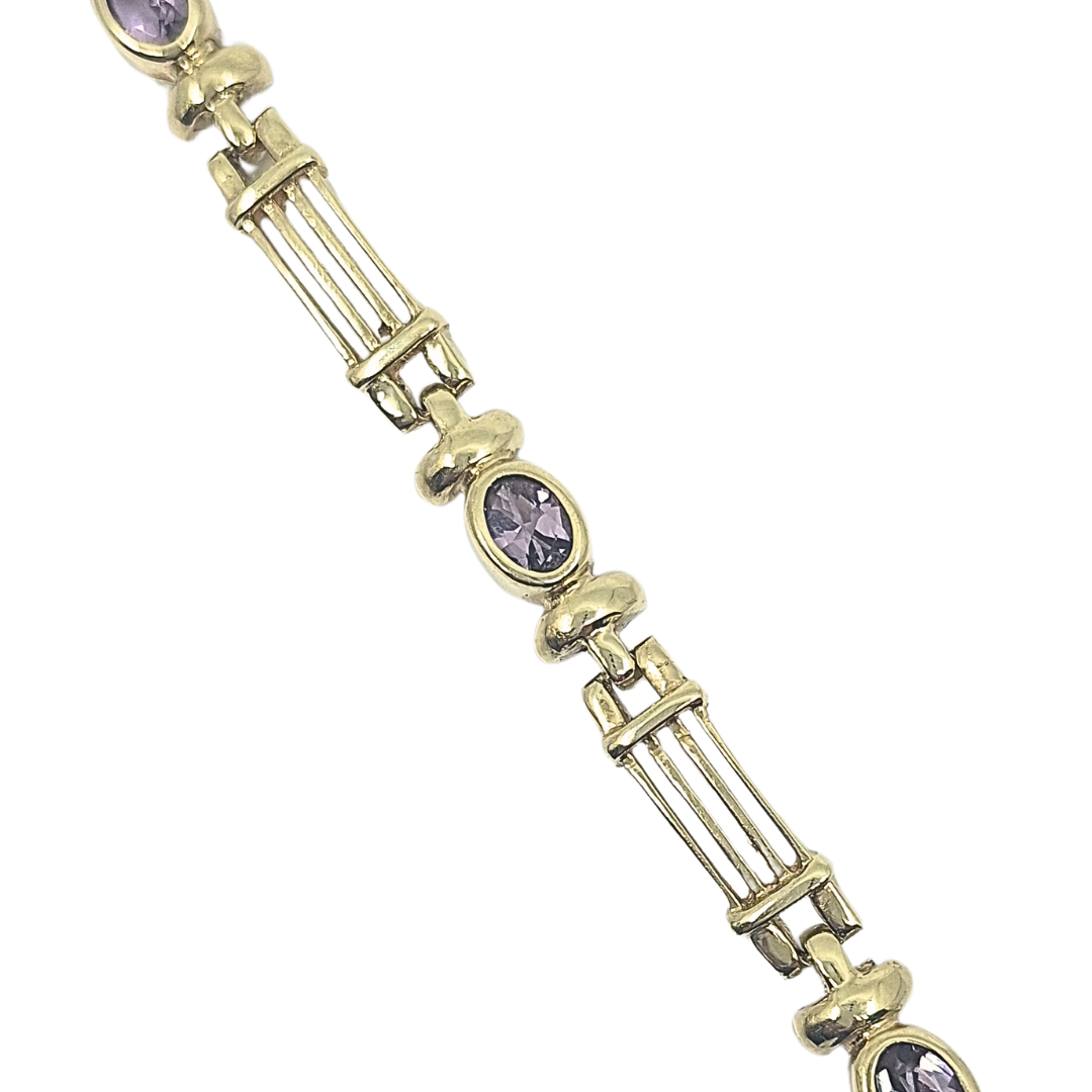 Pre-loved 9ct yellow gold amethyst bracelet combines elegant colour with a refined design. Featuring four oval-cut amethyst gemstones spaced evenly along a fancy link chain, it offers a vibrant pop of purple against the warm tones of yellow gold.