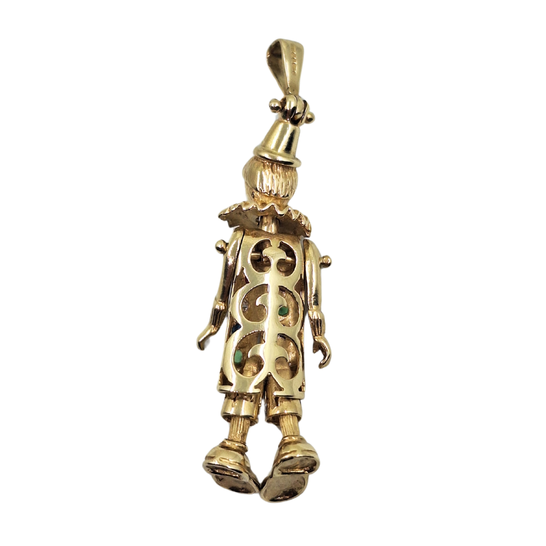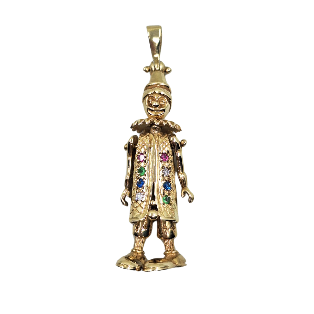 Pre-Loved 9ct yellow gold clown pendant, a whimsical piece of jewellery that combines fun and colour with the elegance of yellow gold. This pendant is meticulously crafted in 9ct yellow gold and adorned with a delightful array of coloured cubic zirconia stones, creating a cheerful and eye-catching accessory.