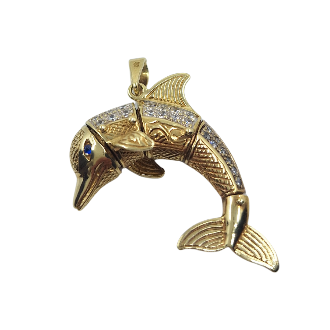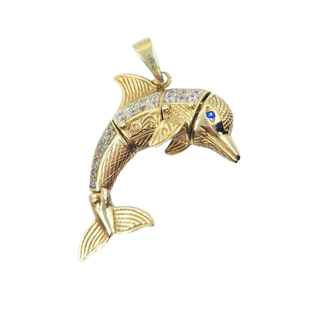 Pre-loved 9ct yellow gold cubic zirconia dolphin pendant, a charming piece that captures the playful spirit of the sea. Expertly crafted from high-quality 9ct yellow gold, this delightful pendant features a beautifully designed dolphin, symbolizing joy and freedom.