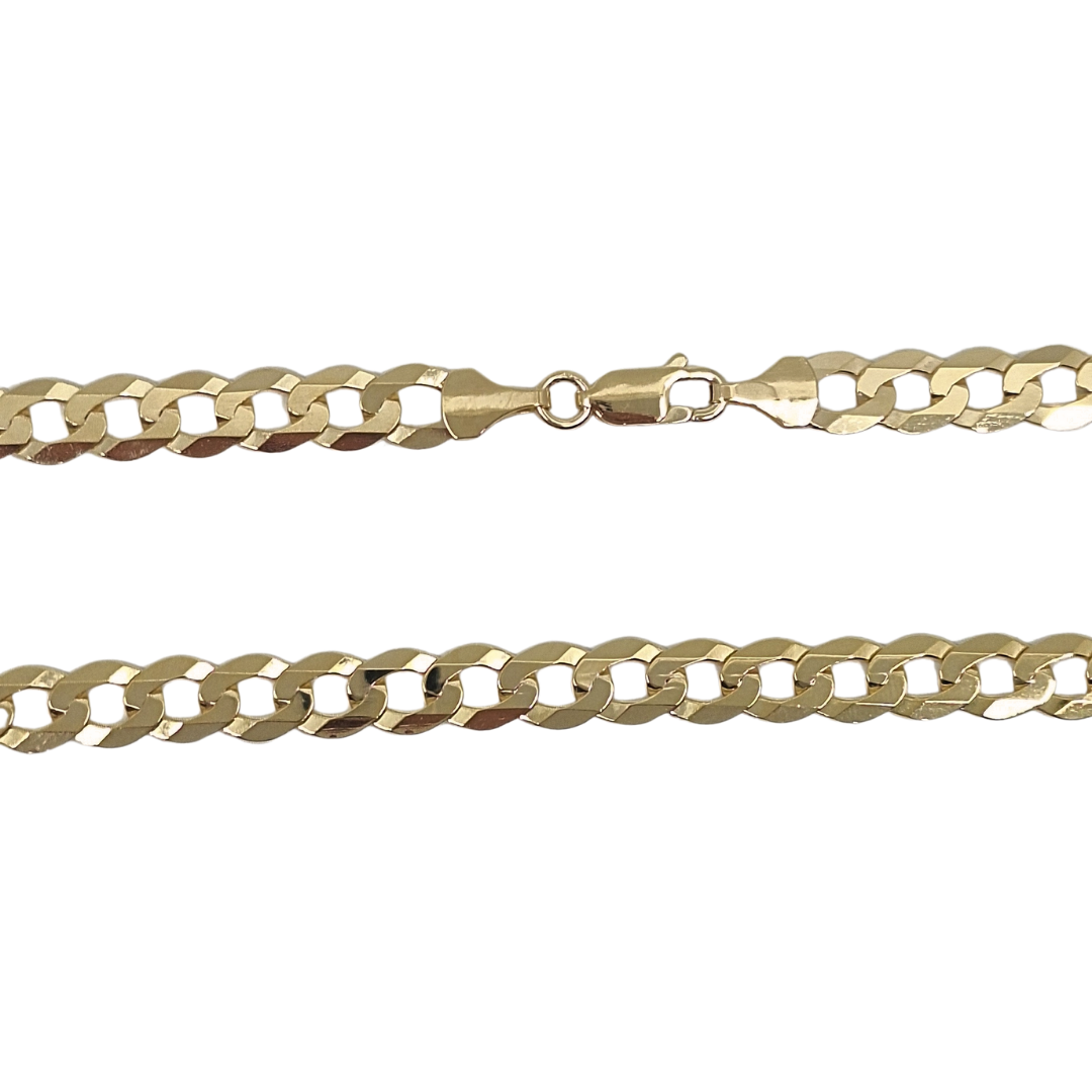 This 9ct yellow gold curb chain features flat, polished solid links that sit comfortably and create a clean, traditional look. The simple design makes it suitable for everyday wear, either on its own or with a pendant. A classic gold chain with a bright finish and timeless style.
