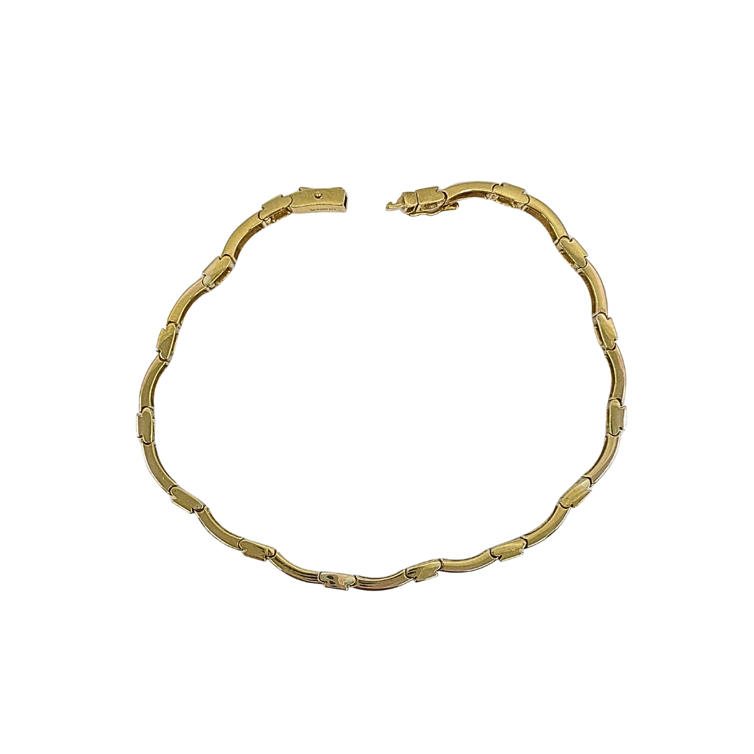 Pre-loved 9ct yellow gold bracelet features spaced-out diamonds totalling 0.15ct, offering subtle sparkle along the wrist. Designed with a secure push-in clasp and safety catch, it combines style with peace of mind. A timeless piece that’s perfect for everyday elegance or adding a touch of luxury to special occasions.