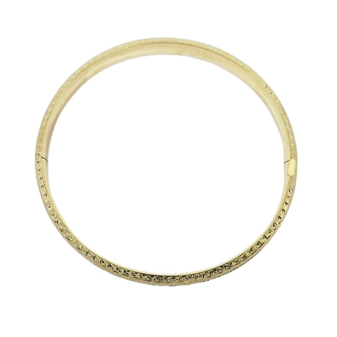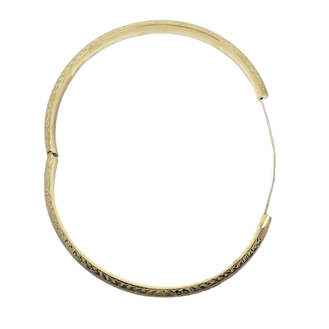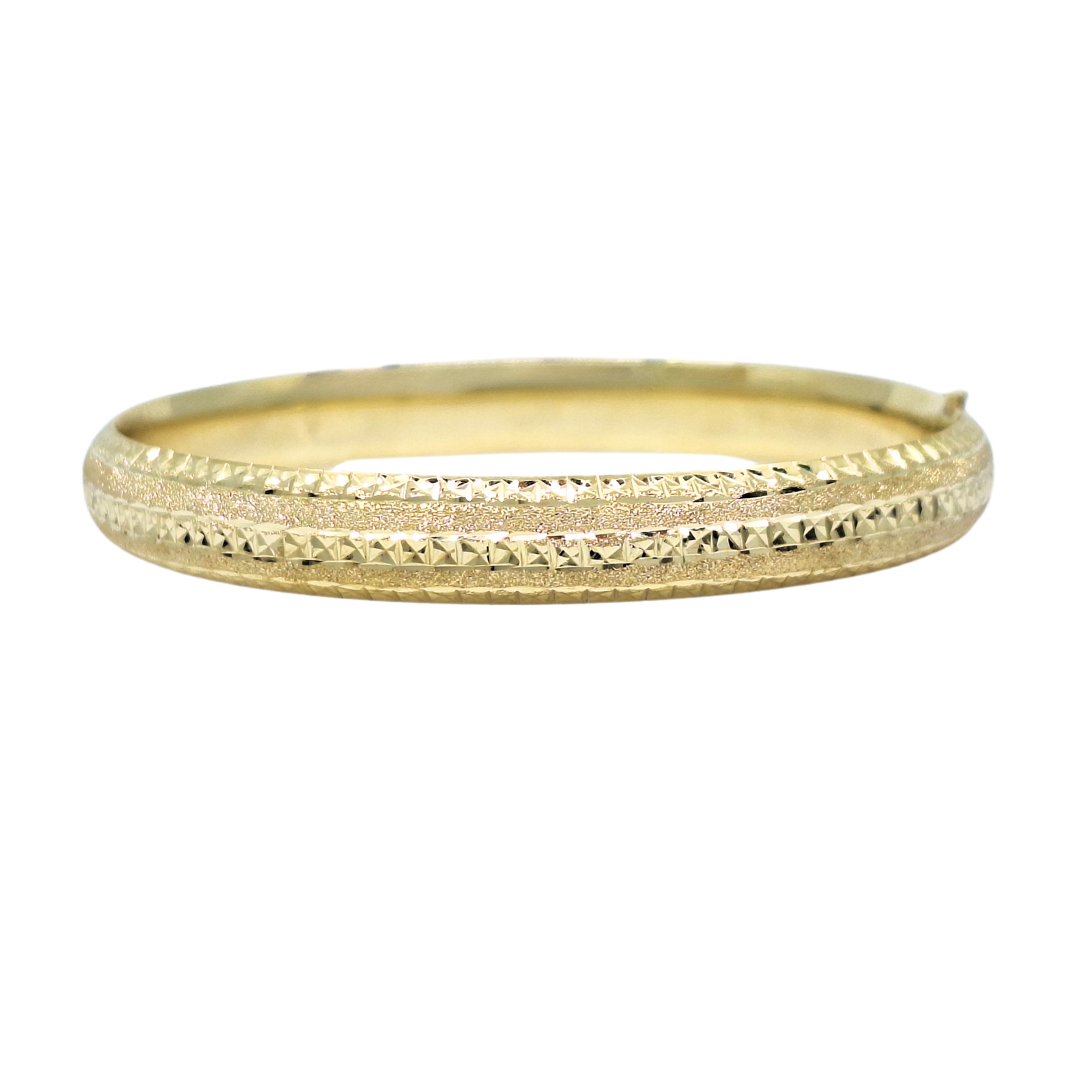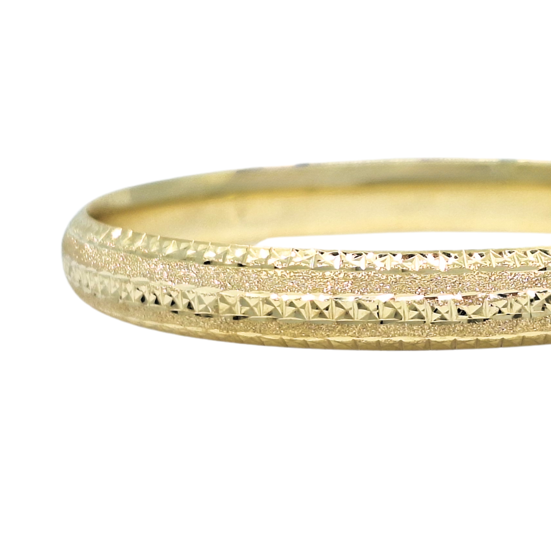 9ct yellow gold expanding slave bangle combines classic design with practical functionality. Featuring intricate engraved detailing, this beautiful bangle opens with a secure push clasp and an internal expanding bar, allowing it to widen for easy wear before clipping securely shut. Its elegant craftsmanship and timeless style make it a stunning addition to any jewellery collection.