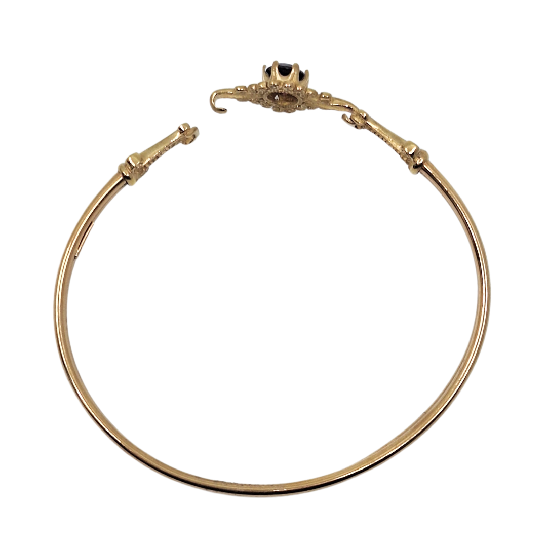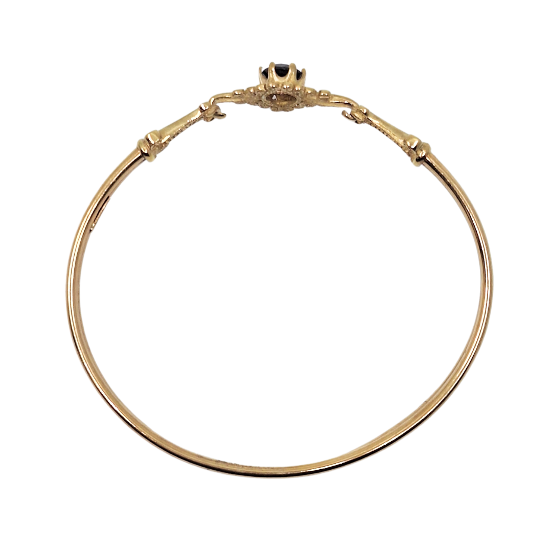 Pre-loved 9ct yellow gold garnet bangle is a timeless piece of sophistication. Featuring a stunning oval garnet as its centrepiece, the gemstone is beautifully framed by intricate decorative gold detailing that adds a touch of vintage charm. The bangle is designed with a secure front clip fastening for ease and comfort, ensuring it stays perfectly in place. Whether worn alone or layered with other bracelets, this exquisite piece is perfect for adding a pop of colour and elegance to any outfit. A classic addition to any jewellery collection.