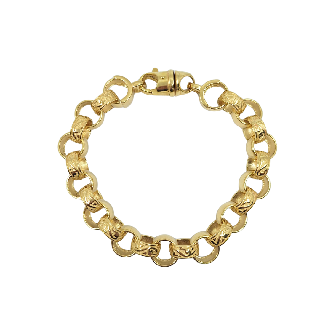 9ct yellow gold pattern and plain belcher bracelet. This stunning piece features a harmonious blend of alternating patterned and plain links, creating a dynamic design that adds texture and visual interest. The elegant interplay between the polished and patterned sections ensures that this bracelet stands out, making it a perfect choice for both everyday wear and special occasions.
