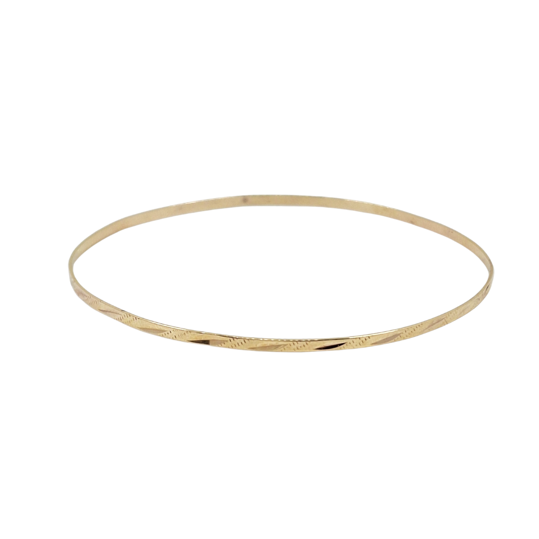 Pre-loved 9ct Yellow Gold Patterned Slave Bangle is a timeless classic with a touch of detail. Crafted in polished 9ct yellow gold, the bangle features a slim profile with an elegant engraved pattern running along the front, adding subtle texture and sparkle as it catches the light.