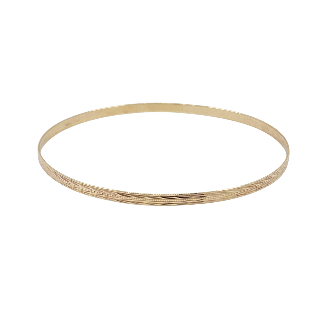 Pre-loved 9ct Yellow Gold Patterned Slave Bangle is a timeless classic with a touch of detail. Crafted in polished 9ct yellow gold, the bangle features a slim profile with an elegant engraved pattern running along the front, adding subtle texture and sparkle as it catches the light.