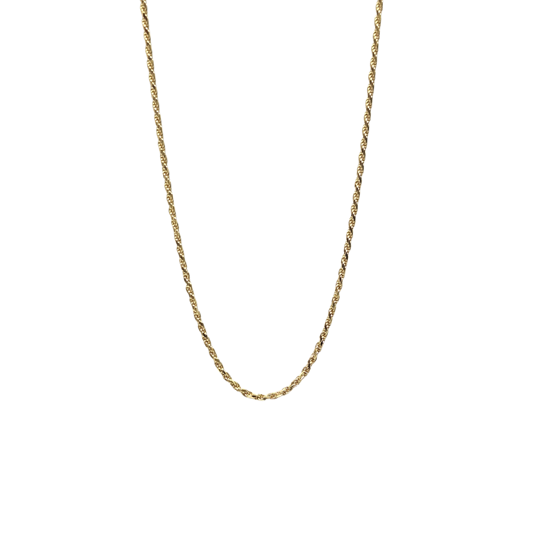 This 9ct yellow gold rope chain features a twisted link design with a polished finish that reflects light well. The rope style gives it a traditional, textured look while still sitting comfortably when worn. A simple and versatile chain suitable for everyday use, either on its own or paired with a pendant.