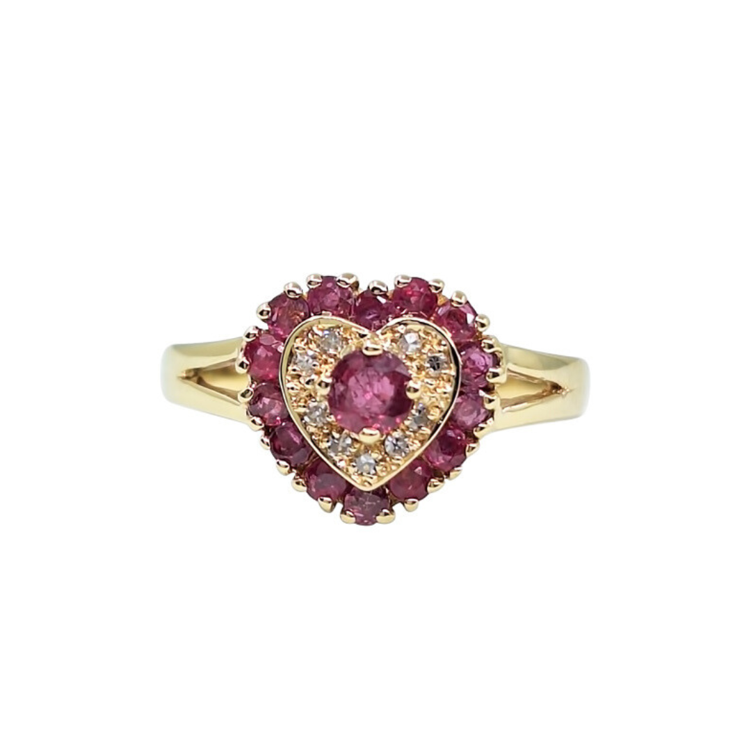 Pre-loved 9ct yellow gold ring features a vibrant heart-shaped cluster of rich red rubies, accented by a sparkling border of diamonds. The warm tones of the gold perfectly complement the fiery rubies, while the diamond halo adds a touch of brilliance. A beautiful symbol of love—ideal for gifting or marking a special occasion.
