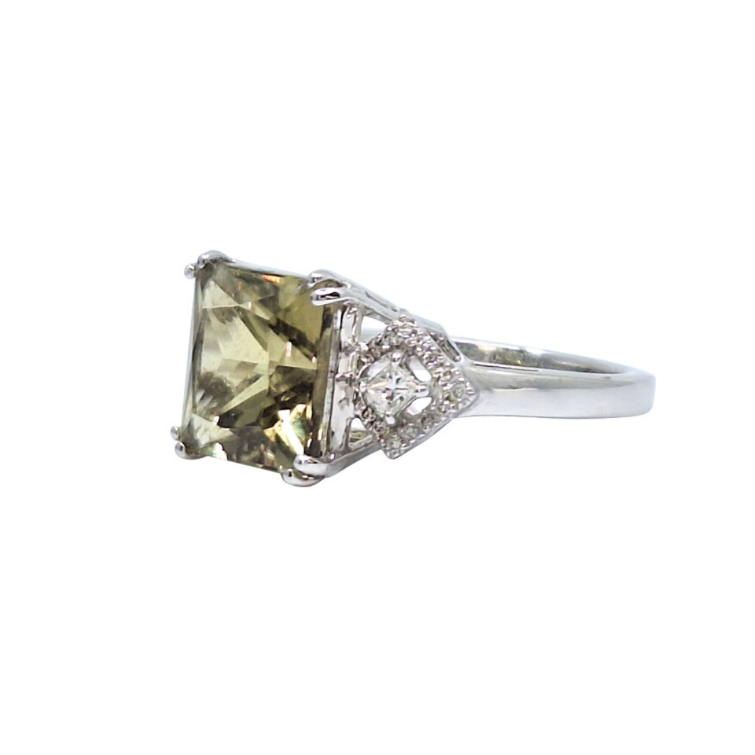 Pre-loved platinum csarite and Diamond Ring, a stunning piece that beautifully showcases the rich hues of csarite. At the centre of this ring is a captivating csarite gemstone, securely set in a double claw setting that highlights its vibrant green colour and remarkable clarity. This unique setting not only enhances the stone's brilliance but also provides a striking contrast against the lustrous platinum band.