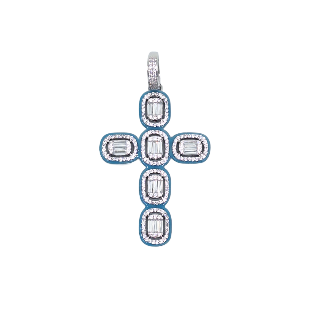This sterling silver cross pendant combines classic symbolism with modern detail, featuring sparkling cubic zirconia and rich enamel accents. The contrast between the polished silver, shimmering stones, and bold enamel gives this piece a striking, contemporary edge. Designed to be worn on a chain of your choice, it’s a meaningful and eye-catching addition to any jewellery collection. Chain not included.